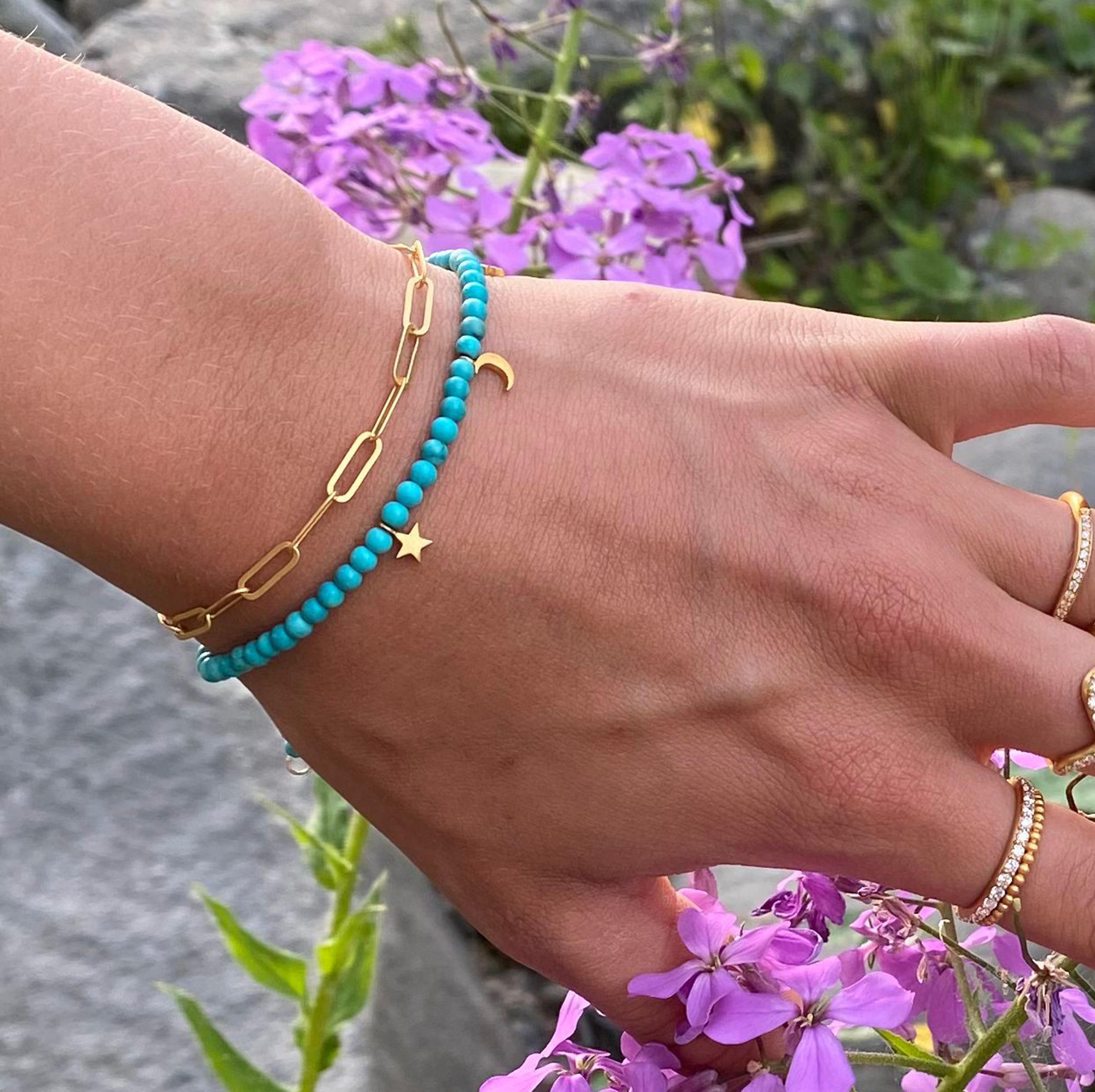 Türkise haben heilende und energetisierende Eigenschaften, die vor negativer Fremdenergie schützen und den/der Träger in dabei unterstützen, Gleichgewicht, Frieden und Liebe zu finden.